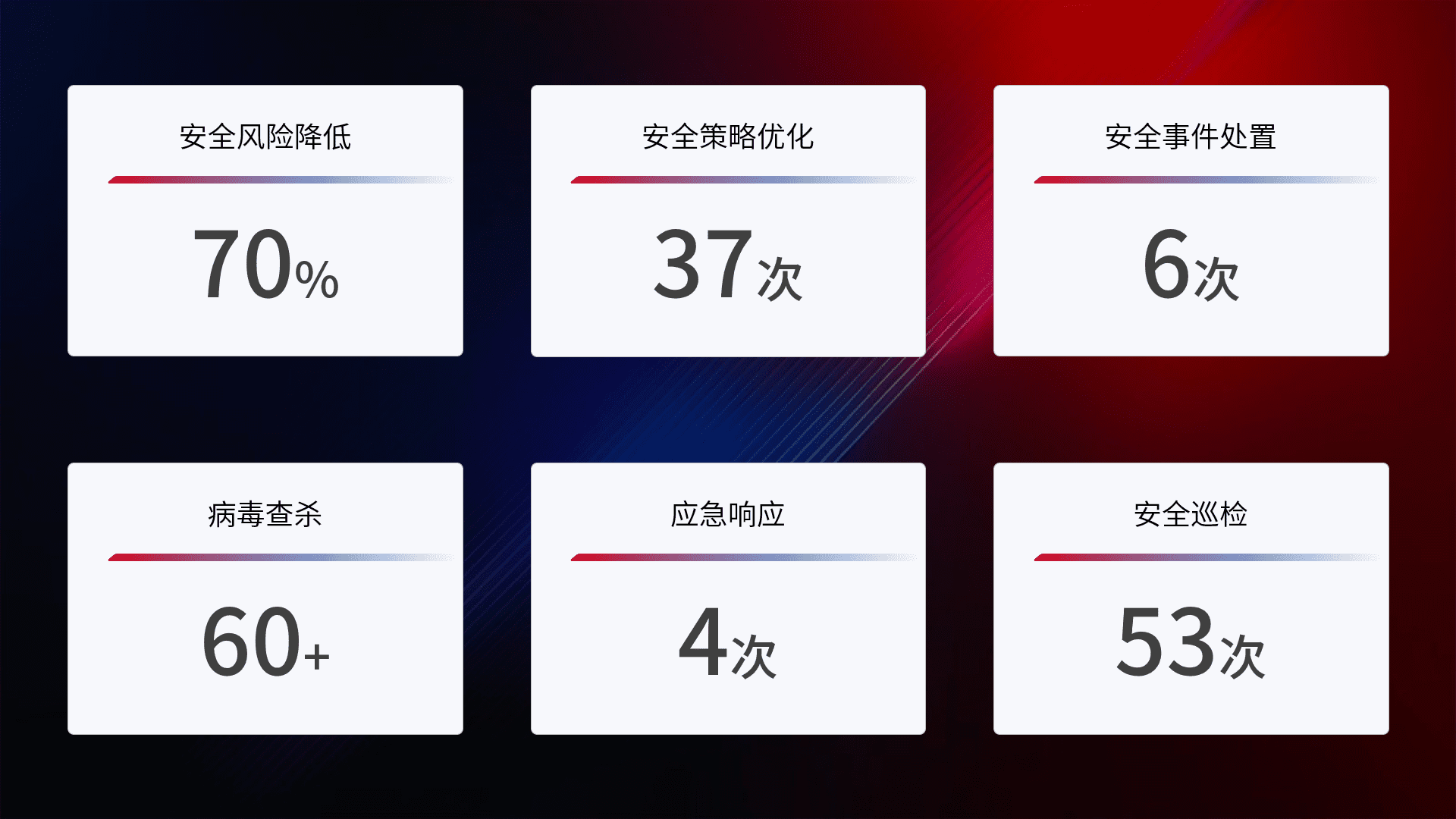 提供全面的安全事件报告体系,,,,包括处置报告、、周报、、、、季度和年度总结,,结合持续监控,,,帮助客户深入了解网络安全状况。。。。